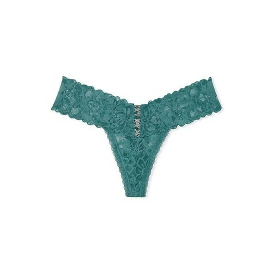This allover lace thong has a discrete yet flirty lace-up detail at back. Lace-up detail at back. No back coverage. Machine wash.
